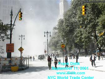 Immediately after the collapse, the entire city was blanketed with dust fallout that ranged in thickness from a thin film, to several inches thick. This dust was later determined to be a low grade health hazard containing a variety of materials including asbestos. Above photographs taken September 11, 2001 about 30 minutes after WTC1 went down. Shot in front of City Hall, 3 blocks from ground zero. |