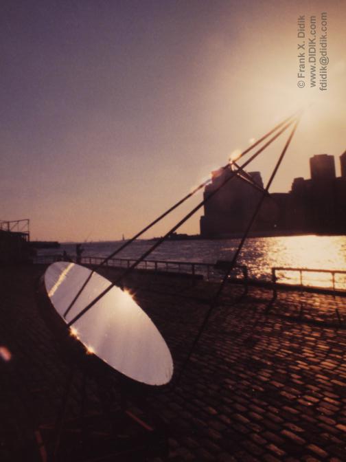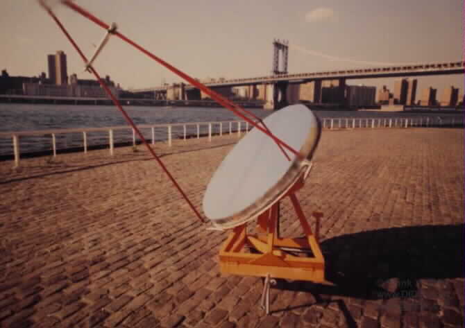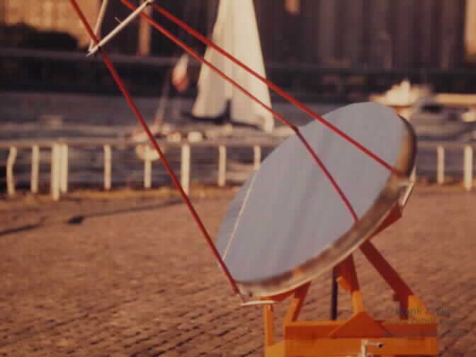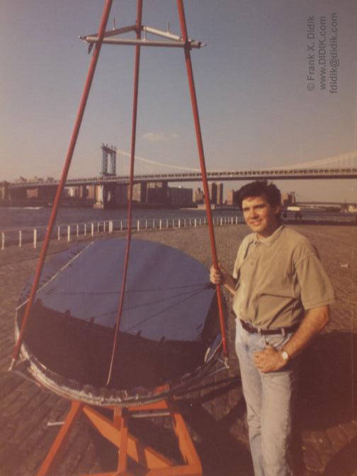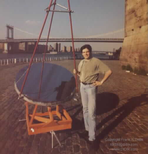 ![[IMAGE]](nysslens.jpg) Thank you for your interest in our solar energy research program. The DIDIK 2000 is an experimental solar collector designed as the first stage of manufacturing inexpensive solar electrical generating systems for commercial applications. The collector consists of a uniquely designed 7' (2 meter 15cm) parabolic mirror manufactured out of a partially flexible material that allows the curvature and thus, the focal length to be altered either manually or by computer control. The focal point ranges from 9 feet to 15 feet (3,000mm to 5,000mm). The DIDIK 2000 is built upon a trailer which incorporates an equatorial mount that allows the primary focusing mirror to follow the sun from morning till night, at any latitude. Adjustments for a particular latitude and/or location is a simple task that can be accomplished in a few minutes.