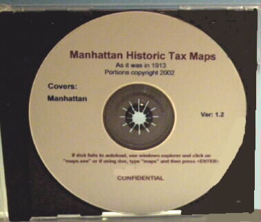 Historic Manhattan (New York City) Real Estate Block and Lot Tax Maps on CD-ROM This cd rom is a land book containing every block and lot tax map covering all of Manhattan, as it was in 1913. It is historically fascinating, and to some degree, still accurate. You can look up a particular address or block and lot and see how the block was at the time. The map indicates the buildings "foot print" on the lot and the lot size. Many key buildings are noted by name or by industry. It shows the original street names, subway and trolly lines and other information that a real estate person would want to know, just after the turn of the century. This cd-rom is memory intensive and requires a minimum of 128 megabytes to work, with more memory recommended. It is designed to run on an IBM or compatible computer.