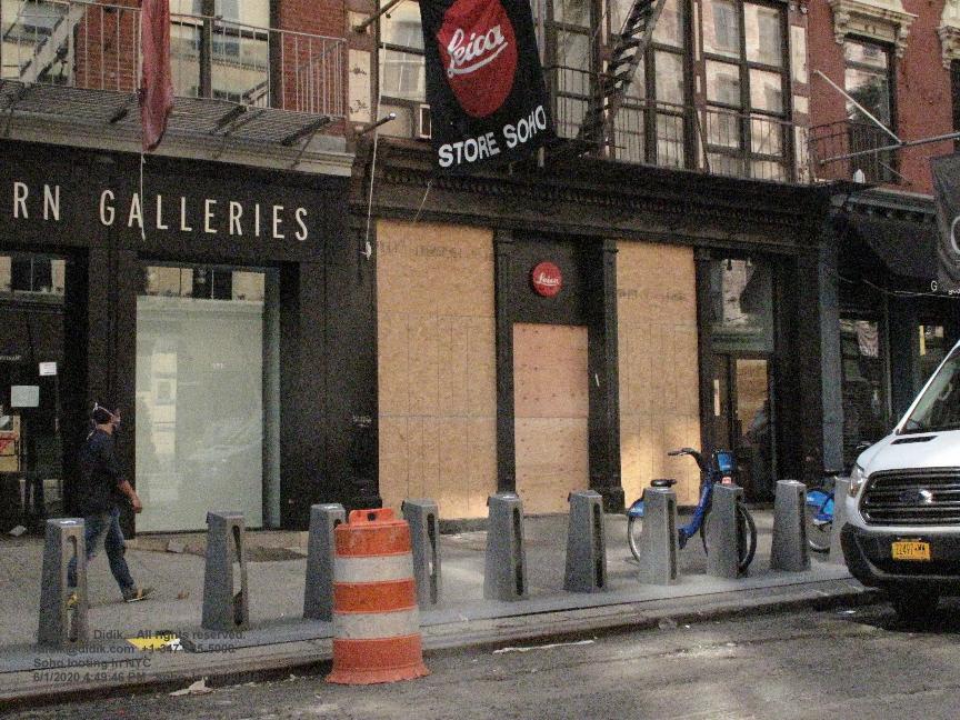 The Leica camera store on West Broadway, boarded up to prevent looting and destruction.